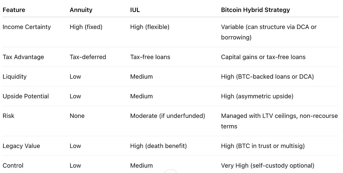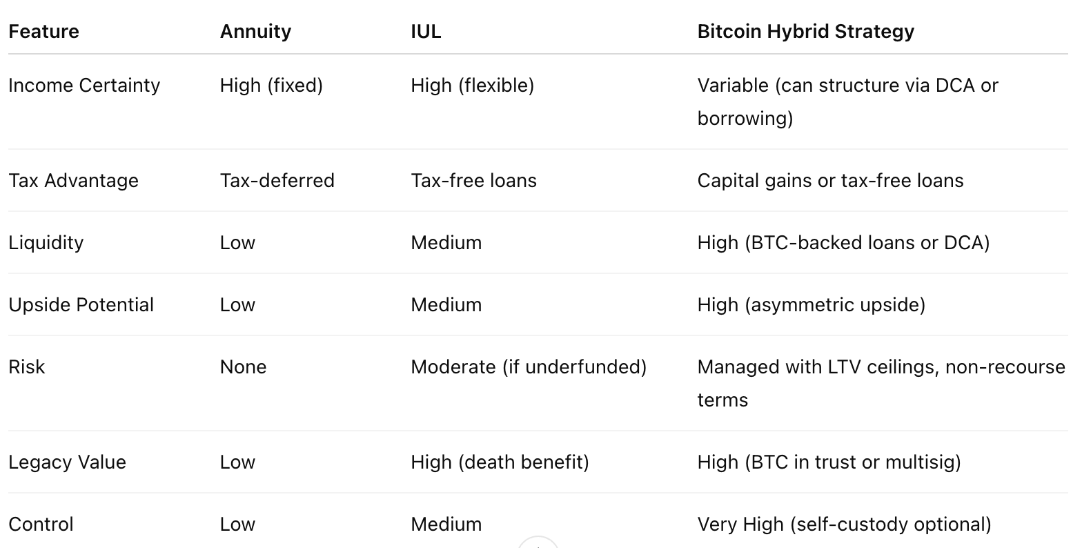 By blending the guaranteed income of annuities, the tax advantages of IULs, and the sovereignty and appreciation potential of Bitcoin, you create a three-layered fortress: