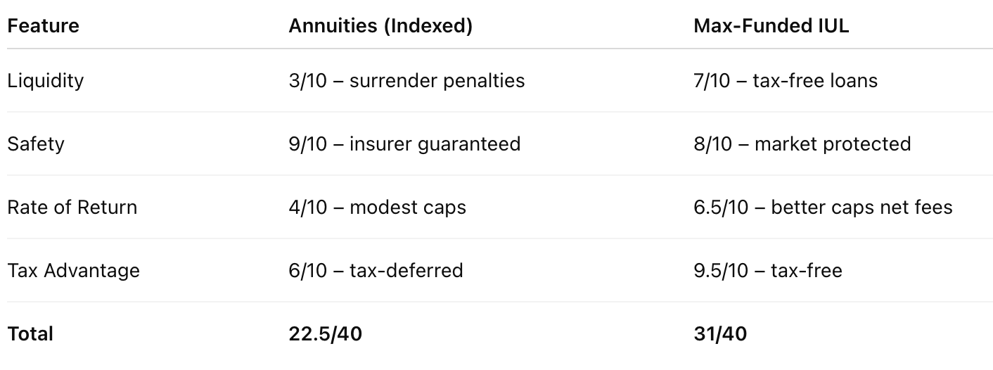 Today, on mainstream media and online channels via “finfluencers” on social media and YouTube, GenX and Boomer investors are being steered toward annuities or max-funded Indexed Universal Life (IUL) policies, each with powerful advocates and compelling use cases.
