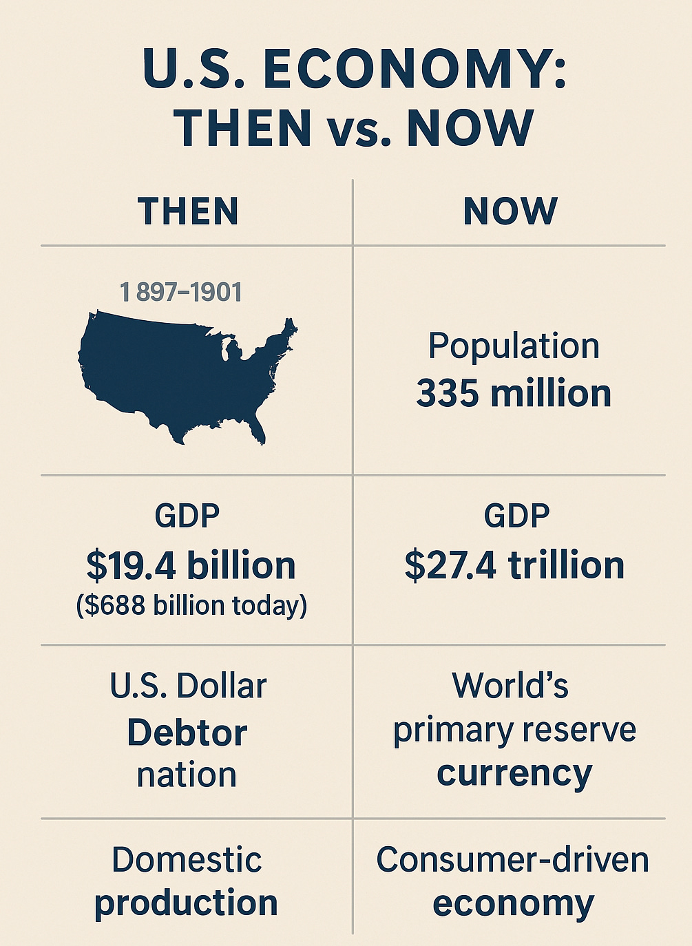 During President McKinley’s time (1897–1901), the U.S. population stood at roughly 74 million, and GDP in 1900 was just $19.4 billion, equivalent to about $688 billion today after inflation. The economy was rooted in agriculture and early-stage manufacturing, with steel, railroads, and coal driving output.