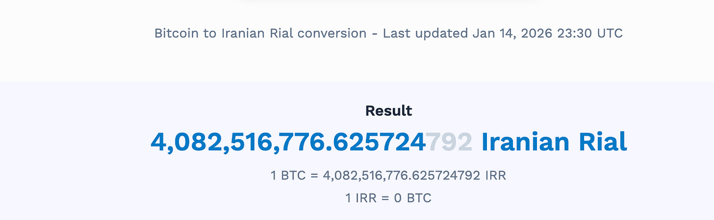 Ignorant folks will tell you that Bitcoin is too volatile, but the current 1BTC to USD exchange rate of $97K USD has nothing to do with BTC and everything to do with the fiat its being priced in. As you can see above, that same single bitcoin would now cost 4.1 trillion rial on January 14th, 2026—preserving value when fiat fails. And unlike gold or silver, you can cross any border with it because it’s weightless and invisible.