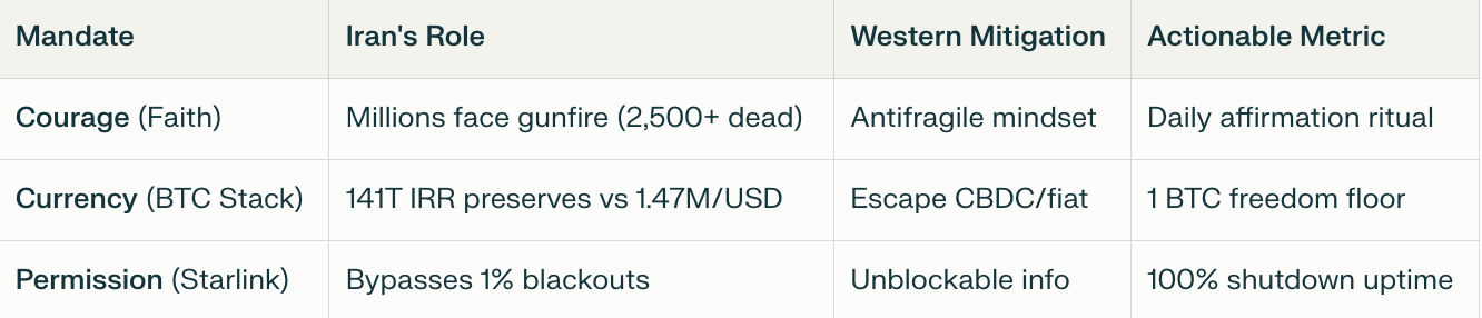 The past several months in Iran have reminded the world that revolutions ignite not from grand speeches but from human courage, are amplified by connectivity, and are fueled by permissionless currency. Millions of ordinary Iranians now access three uncontrollables by any regime: courage, incorruptible (stateless) currency, and satellite connectivity. These three assets form the free mandates of personal liberty—two of them (Bitcoin and Starlink) are purchasable or providable, one is accessed only innately via faith: courage.