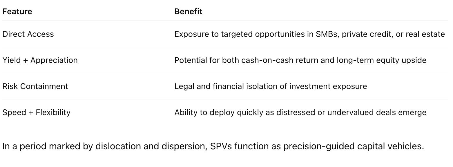SPVs offer a scalable and flexible way to exit the sidelines and deploy capital into the economy's most underserved and undervalued segments, especially SMBs and real estate.