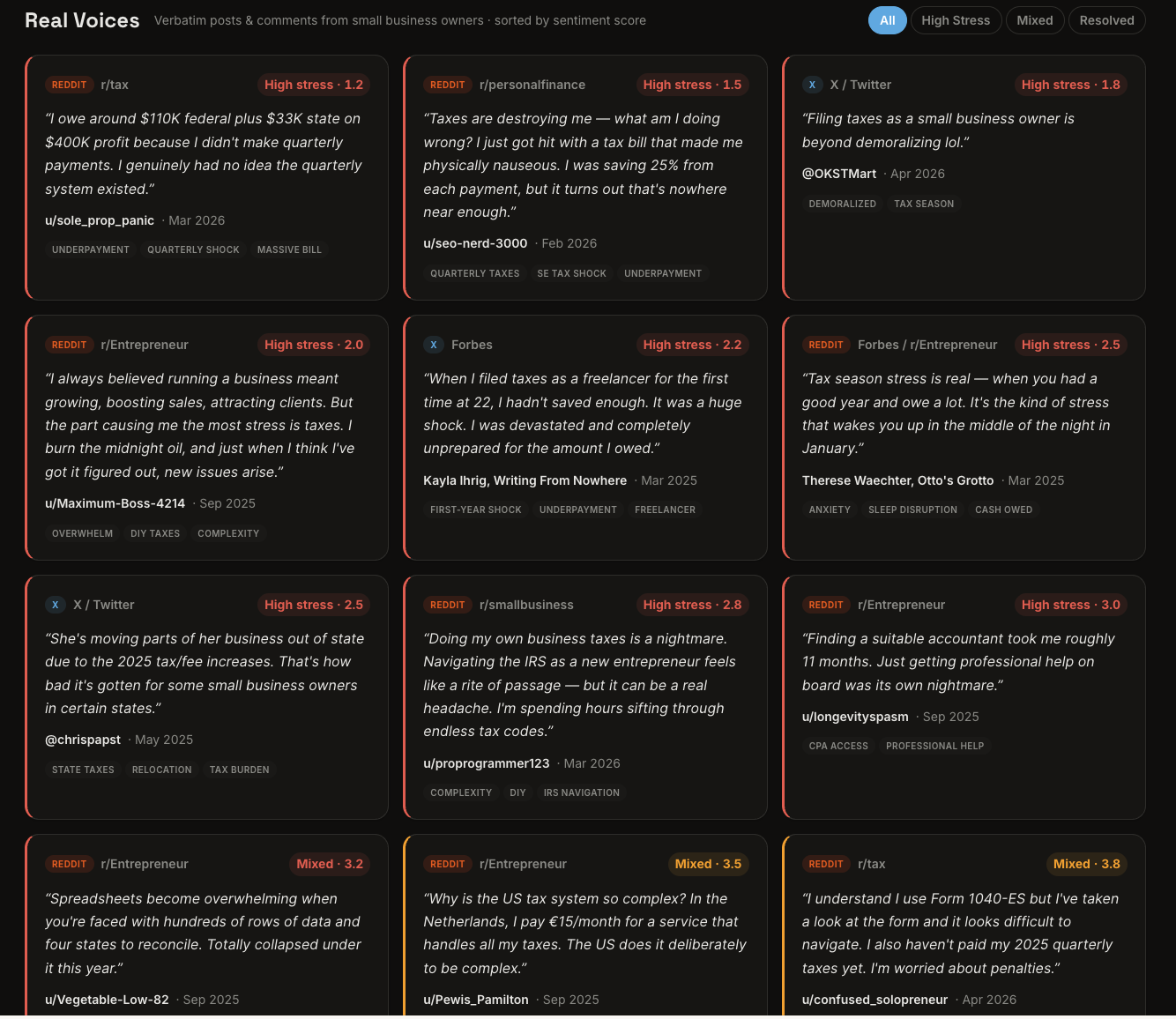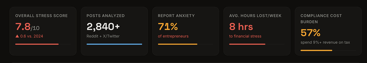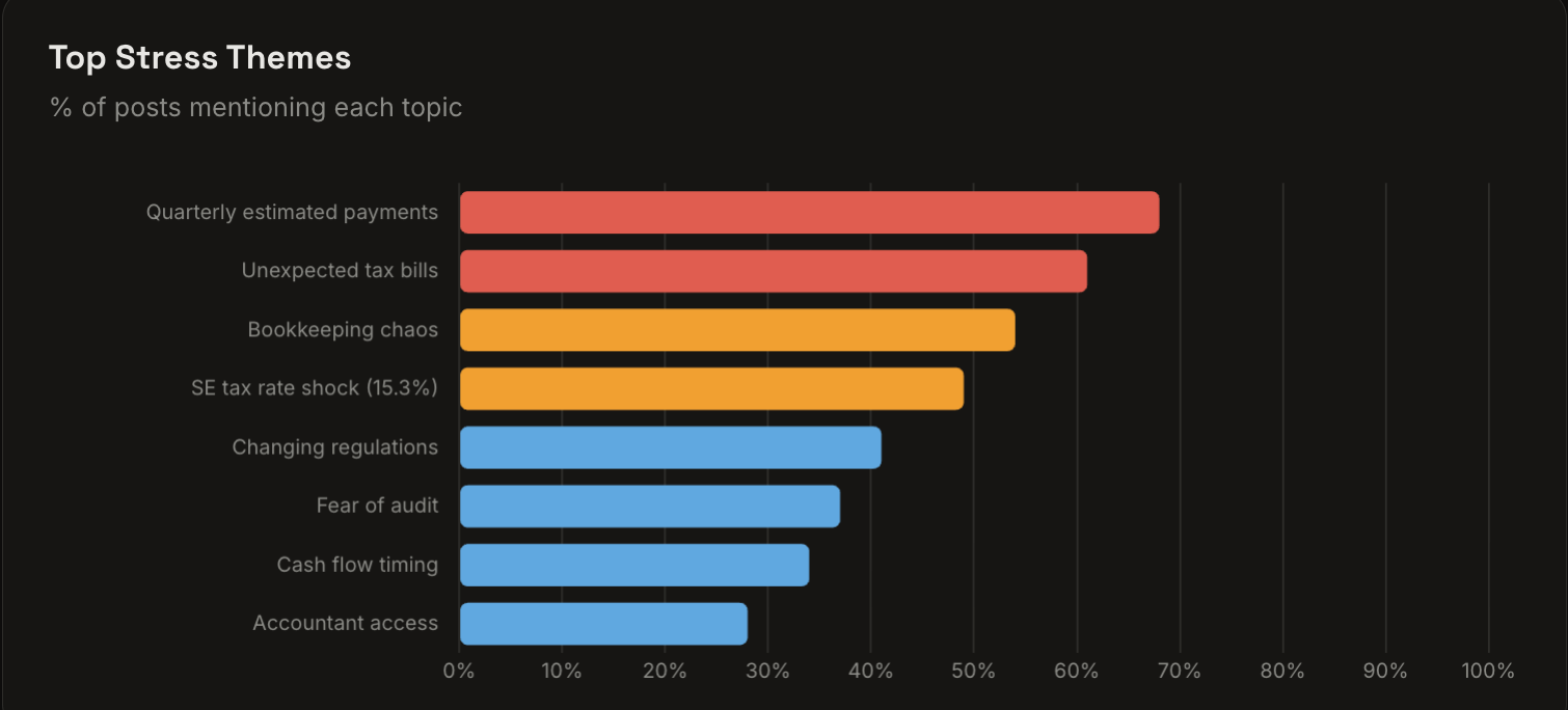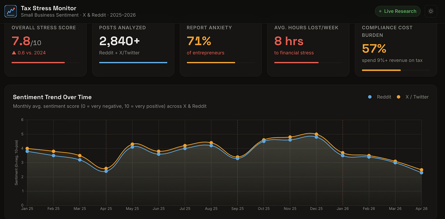 If you’re reading this on the web version of Substack or the app, the Tax Stress Dashboard is embedded above the fold — scroll back up and spend two minutes with it. It maps self-employment tax anxiety across Reddit, X, and survey data: by month, by trigger, by the actual language people use when they describe what taxes do to them. You can interact with it by income tier, business structure, and filing status.