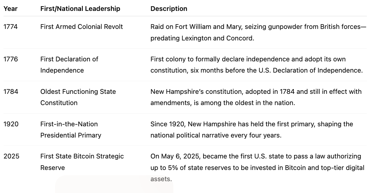 From raiding British forts to writing the first state constitution, from hosting the nation’s first presidential primary to now pioneering digital asset policy, New Hampshire has always been first to leap.