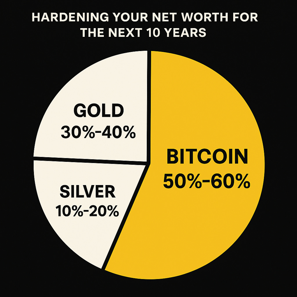 The Institutional Allocator (family offices, endowments): 50% Bitcoin, 35% gold, 15% silver. Align with liquidity and fiduciary optics while maximizing upside.