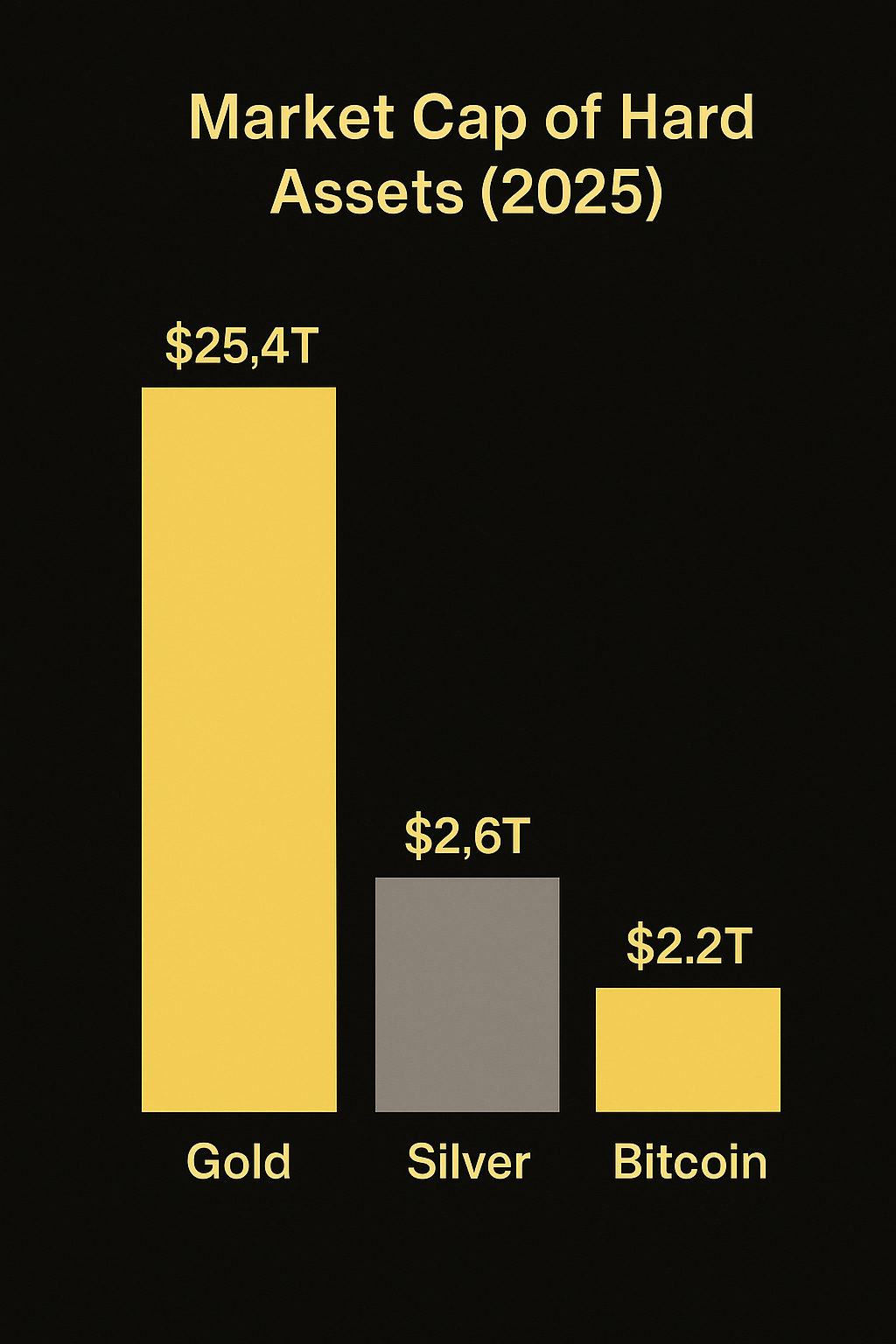 Gold commands a staggering $25.4 trillion market cap, representing roughly a third of all store-of-value assets on the planet. It’s the heavyweight champion—the ballast of central banks, the fallback in times of war, currency collapse, or institutional panic.