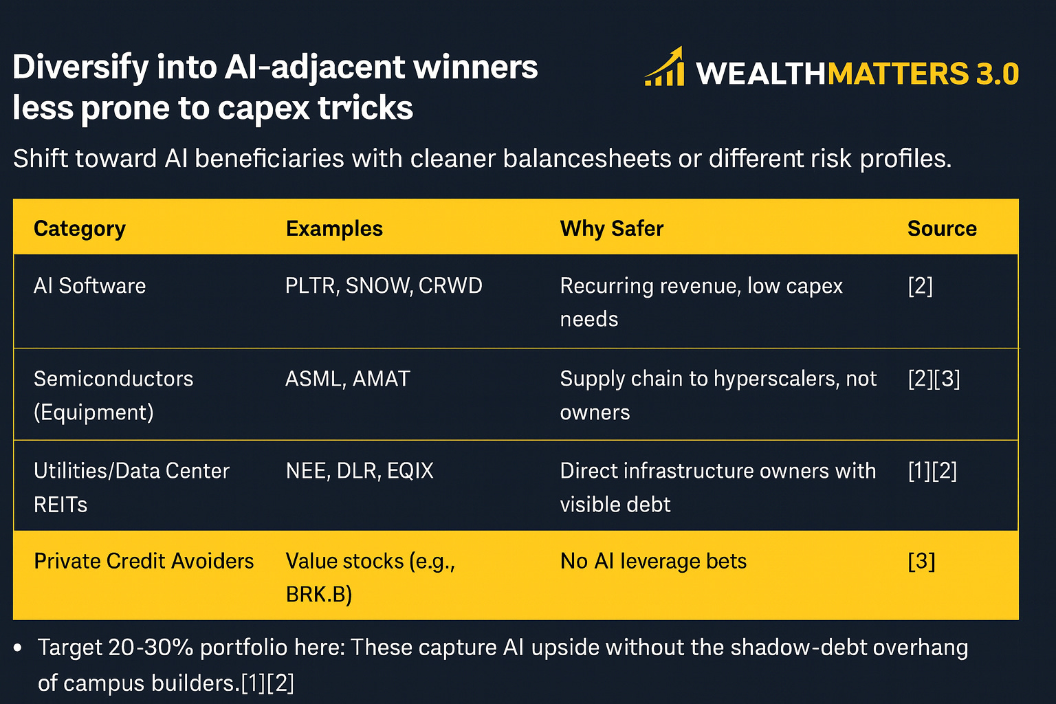 Favor cash-flow proxies: Look for companies with transparent capex (e.g., utilities financing data centers directly) over those relying on private-credit shadows.[1][2]