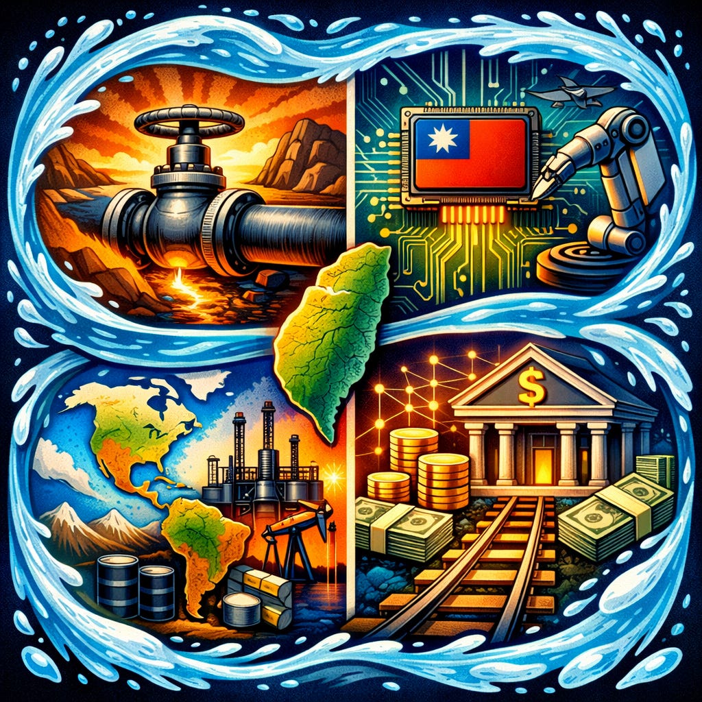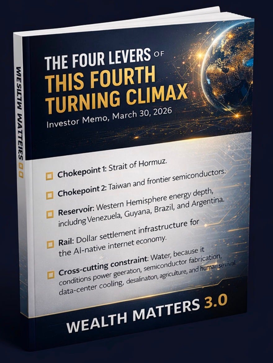 The Iran conflict, Venezuela intervention, Taiwan tensions, and U.S.-China trade confrontation are not separate events. They are the integrated manifestation of a contest for control over four strategic levers: the energy valve at Hormuz, the compute bottleneck at Taiwan, the reserve basin in the Western Hemisphere, and the settlement rails of the digital economy. Water runs through all of them as the biophysical constraint that makes everything else possible—or impossible.