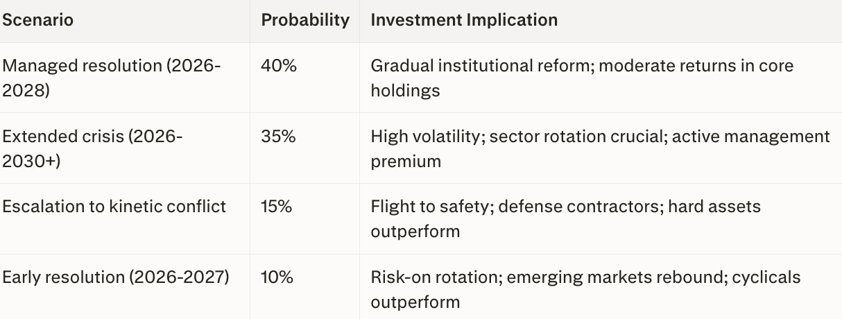 Most likely outcome: Extended but ultimately managed crisis resolution spanning 2026-2030, with multiple escalation/de-escalation cycles creating high volatility but ultimately crystallizing a new U.S.-led order with embedded structural advantages.