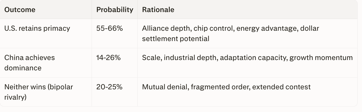 That is not a guarantee of a century of uncontested dominance. It is a recognition that victory in this Fourth Turning climax, combined with structural control over the four levers that enable AI-era production and exchange, creates pathway dependencies and compounding advantages that extend well beyond normal geopolitical forecast horizons.