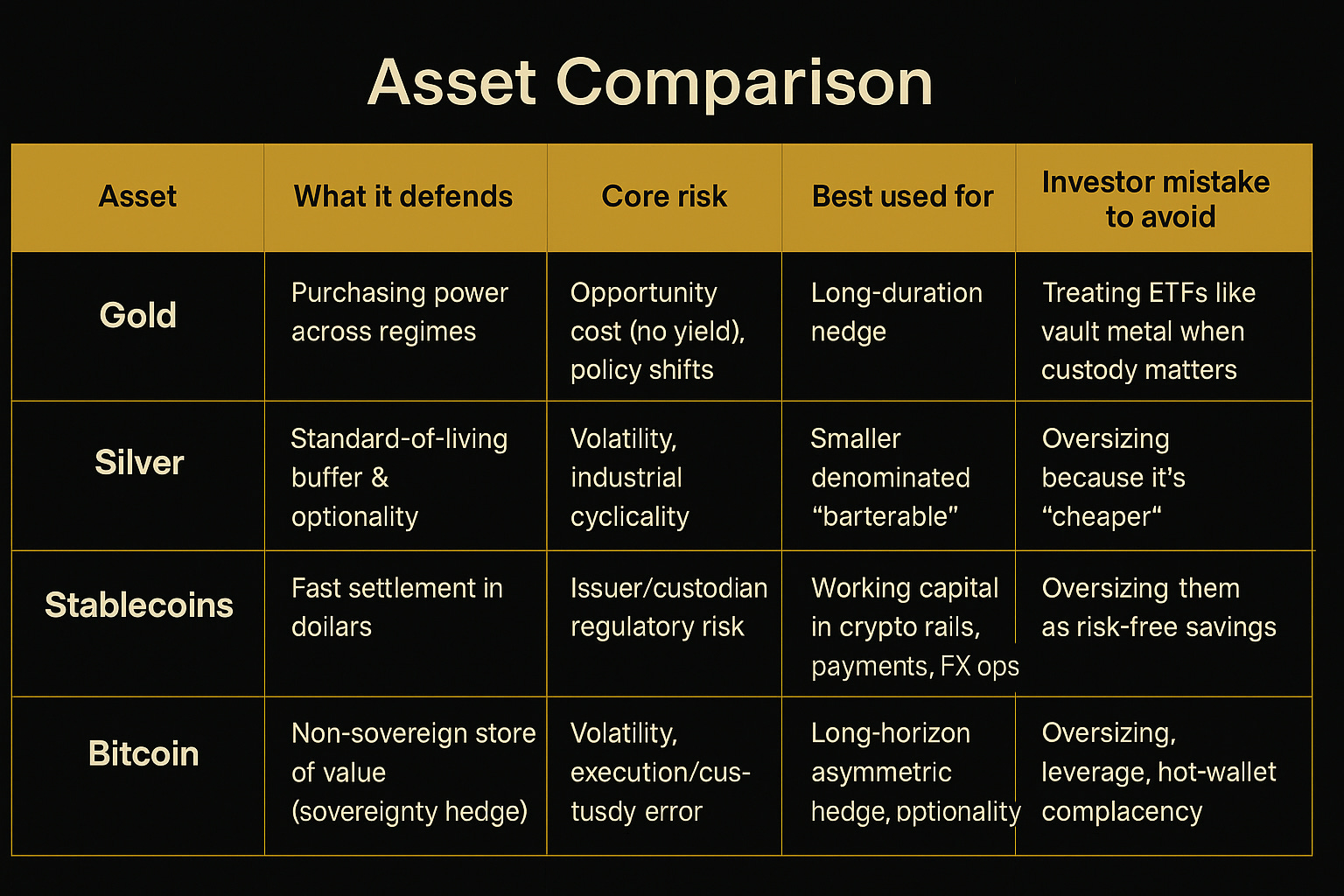 Think of gold as a fireproof safe, silver as smaller fireproof cash boxes, stablecoins as high-speed armored vans, and Bitcoin as a portable vault you can take easily anywhere, whose keys you can memorize or hide in multiple safe analog places. Each has a role; none is a magic wand.