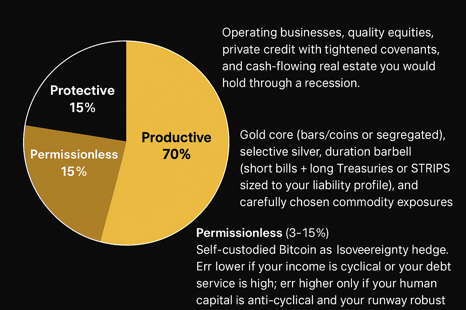 A resilient household or family office doesn’t pick one flavor. It assigns jobs and sizes each bucket with intent. That’s the art: get the mix wrong, and you’re either fragile to inflation (too much “safe” cash), fragile to drawdowns (too much risk), or fragile to gatekeeping (too much dependence on custodians). Get the mix right, and you can act like an investor even when markets tempt you to speculate.