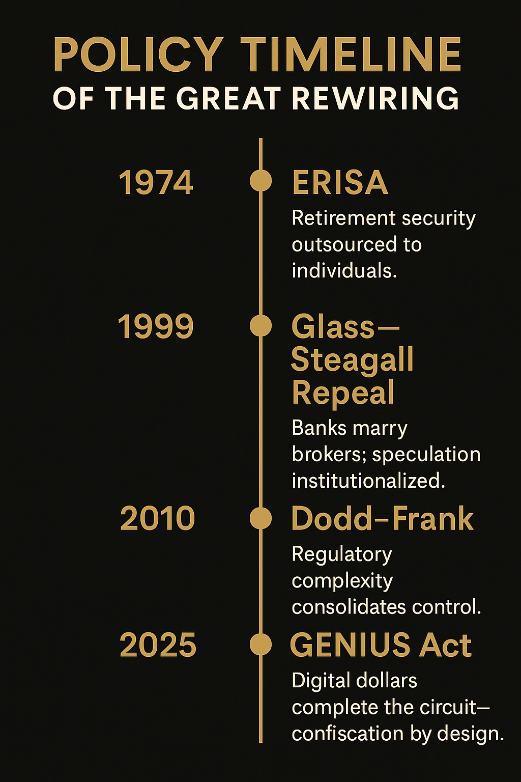 From the ERISA Act of 1974 to the GENIUS Act of 2025, four keystone policies—each sold as “stability” or “reform”—have slowly rewired who owns America.