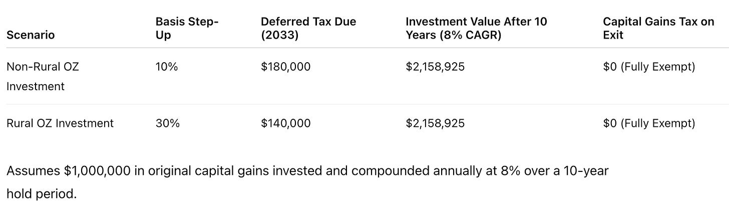 Full Capital Gains Exemption Still Applies: Upon exit, appreciation on a QOZB equity investment held for 10 years remains 100% tax-exempt.