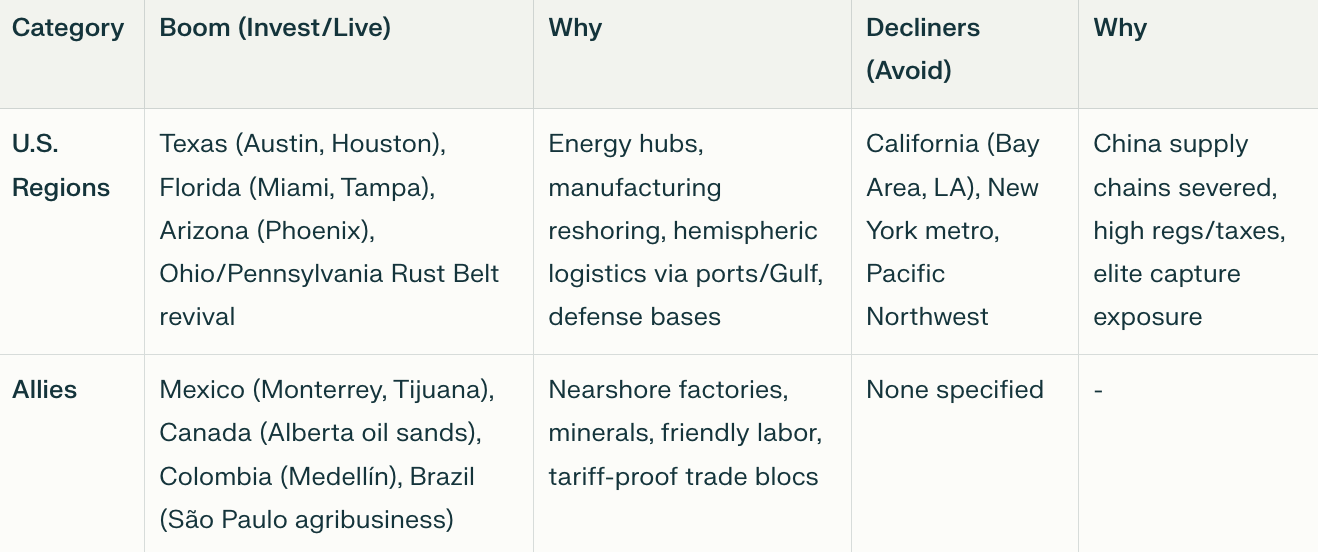 Hemispheric fortification crowns strategic U.S. regions and allies as winners, while coastal globalist hubs fade: