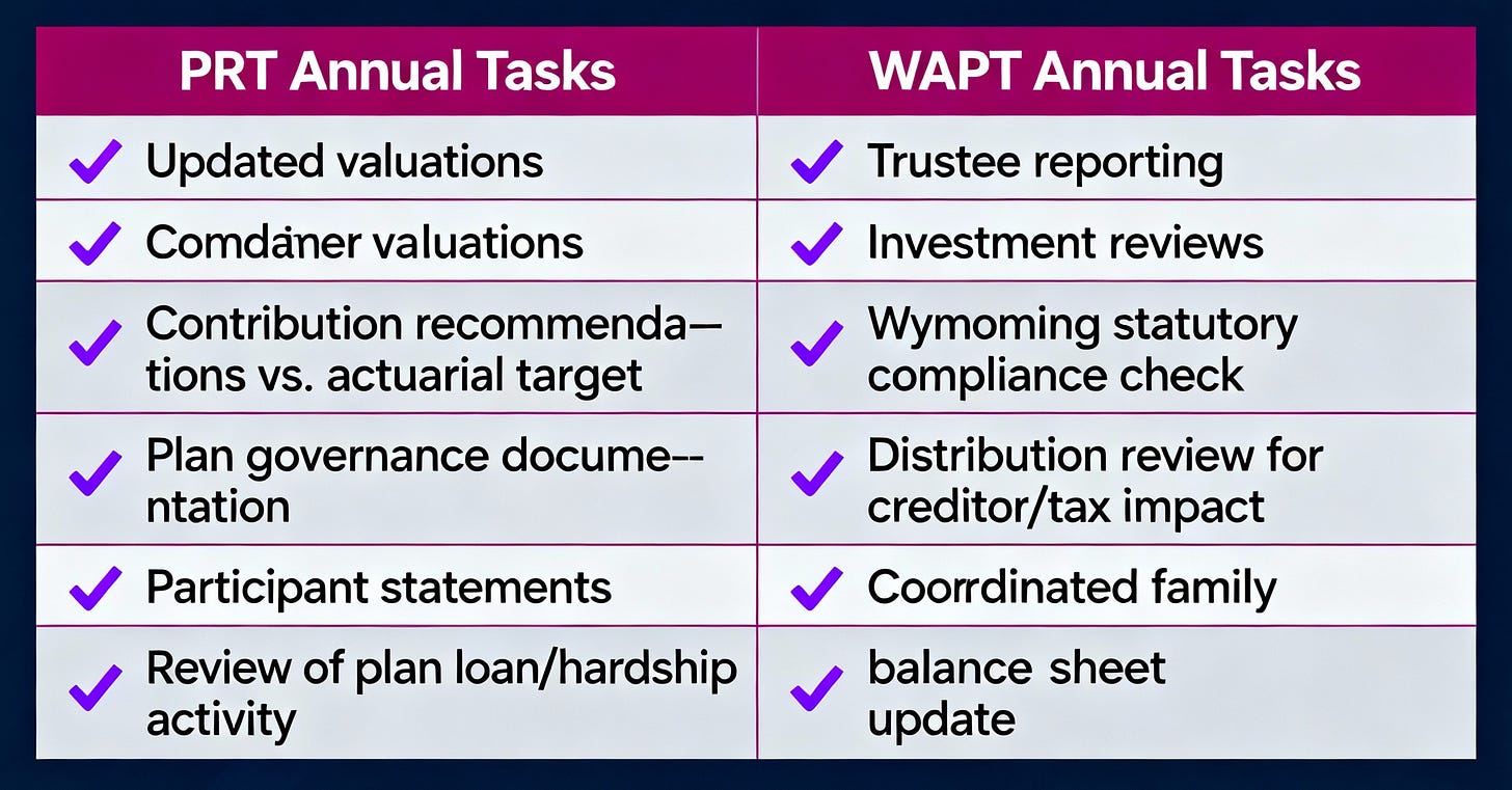 The WAPT requires trustee reporting, periodic investment reviews, and compliance with Wyoming statutory requirements, including attention to any distributions that might intersect with creditor or tax issues. Coordinating both structures in a single dashboard or family balance sheet view helps ensure consistent asset allocation and risk management across protected and non-protected pools.