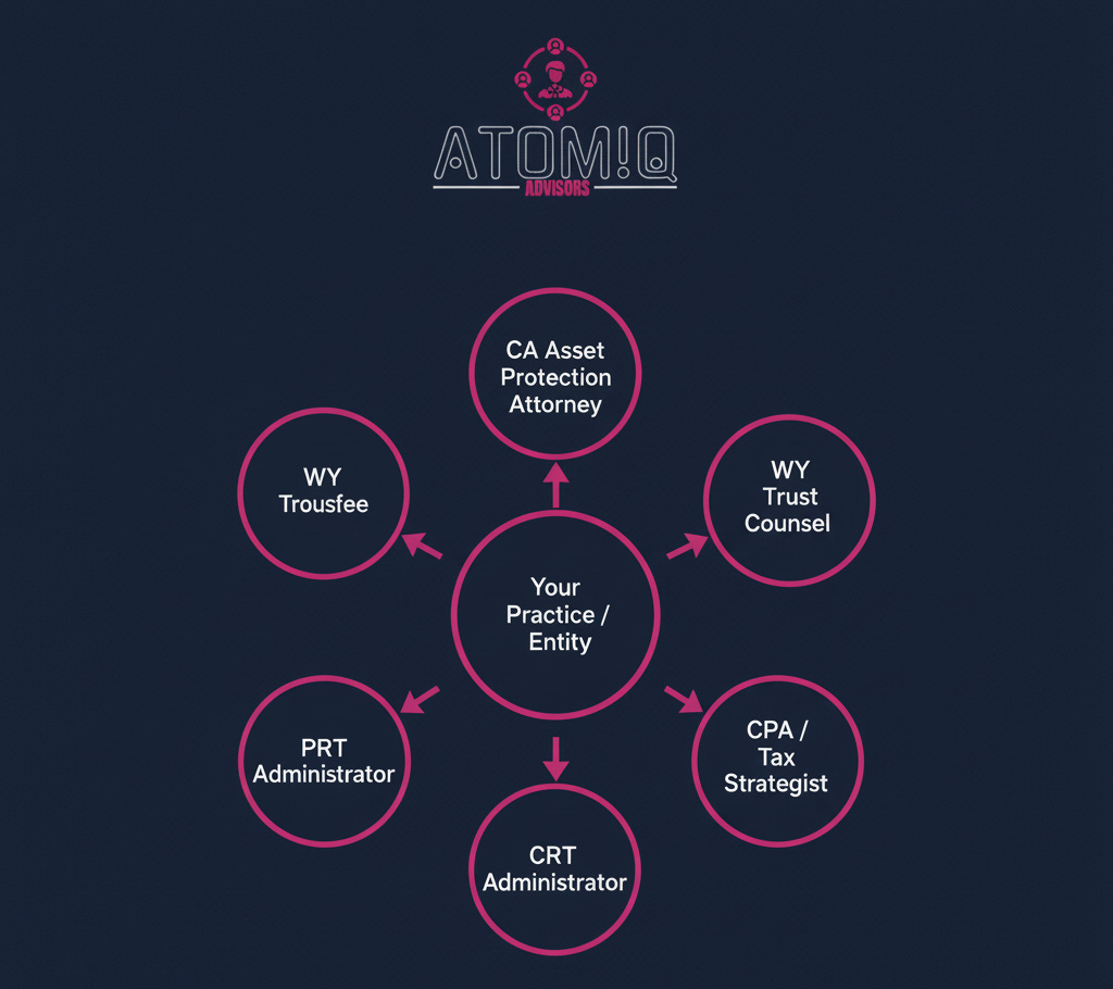 Using a California Private Retirement Trust (PRT) converts surplus profits into exempt “retirement assets” under Code of Civil Procedure §704.115, while a Wyoming Asset Protection Trust (WAPT) adds a second wall of protection under Wyoming’s Qualified Spendthrift Trust statute. Together, they create a two-layer structure that targets both tax deferral and creditor protection for high-net-worth owners in high-risk professions. Now, let’s dig into it a bit more and get you some clarity on who you need on the team to execute something similar.