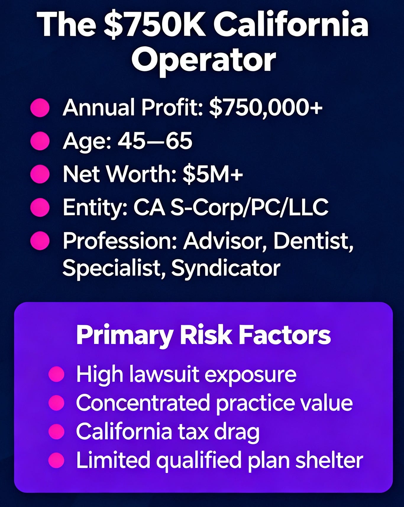 I recently met a California-based business owner (advisor) netting $750,000 in annual operating profit before taxes, with most of that exposed to lawsuits and California’s top 13.3% rate. Traditional employer-sponsored qualified retirement plans barely move the needle for self-employed owner-operators like this, leaving a large chunk of their after-tax wealth vulnerable.